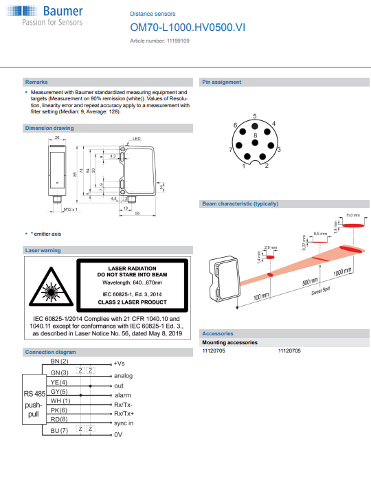 測量距離:100 … 1000 毫米 測量範圍:900毫米 最佳位置:500毫米 觸控顯示螢幕:RS485 通電指示:綠色 LED 輸出指示燈:黃色 LED / 紅色 LED 回應延遲:0.8毫秒 測量頻率:2500赫茲 電源電壓範圍+Vs:15 … 28 VDC 最大電流消耗(無負載):75毫安 輸出訊號:4 ... 20 毫安 / 0 ... 10 VDC 輸出電流:100毫安 防護等級IP: 67 工作溫度:-10 … +50 ℃